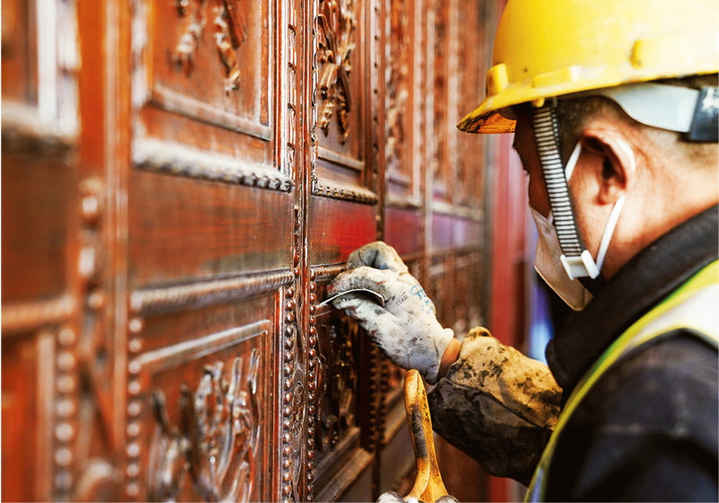 位于上海市興業路76號的中共一大會址紀念館實施修繕改造。圖為2021年3月22日,工人在清理木質雕花板。 新華社記者 劉穎/攝