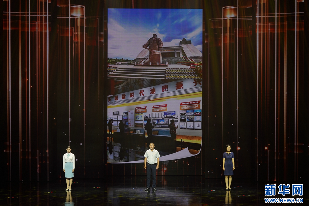 7月17日晚上,紅色紀念館講解員吳麗麗(左)、王立志(中)、程珺喆(右)在講述《我愛你中國》。新華網 肖和勇 攝